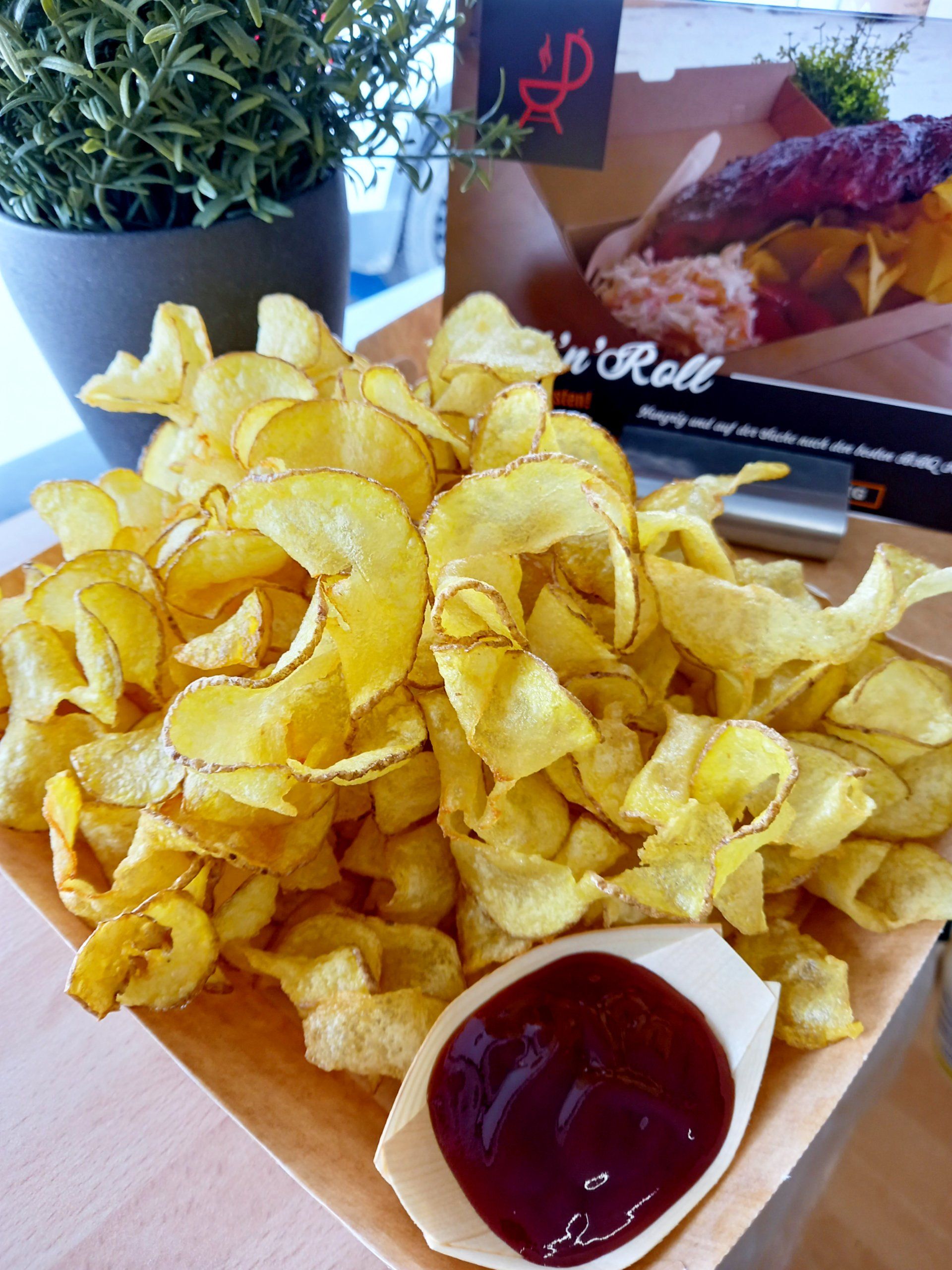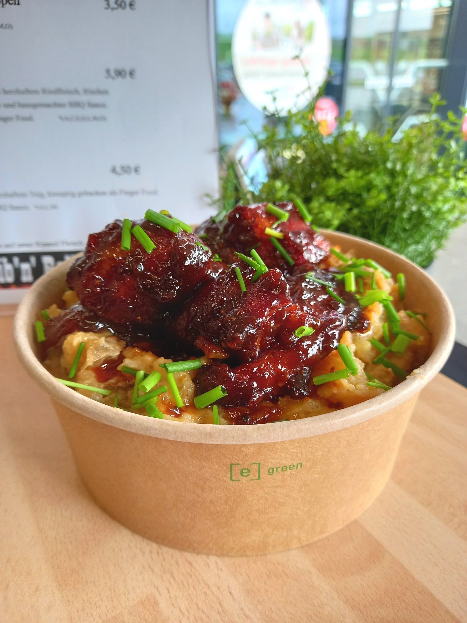 Frittierte Kartoffelspiralen, getoppt mit Pulled Pork, BBQ Sauce, flambiertem Käse und Chimichurri Sauce.