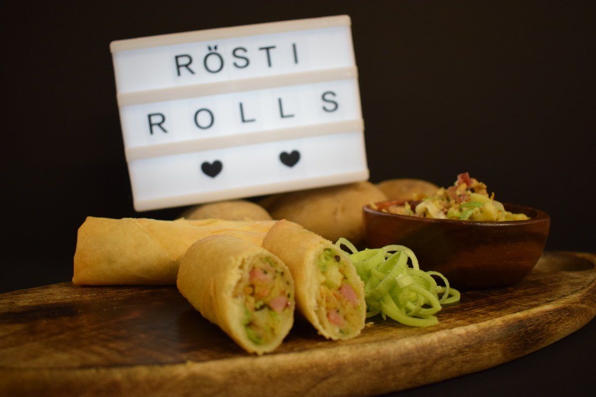 Knusprige Röllchen, gefüllt mit Bratkartoffel, Röstzwiebeln und Speck.