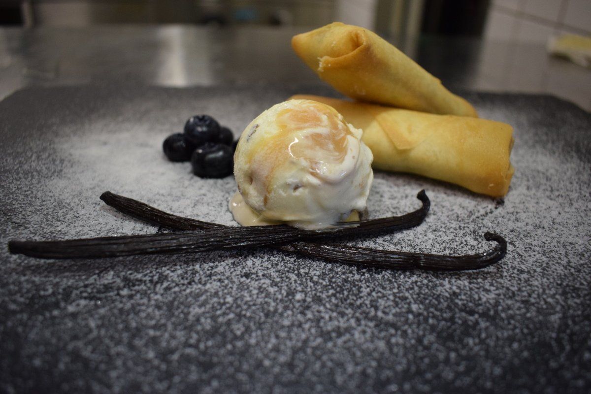Knusprige Röllchen, gefüllt mit Heidelbeeren und Vanillecreme.