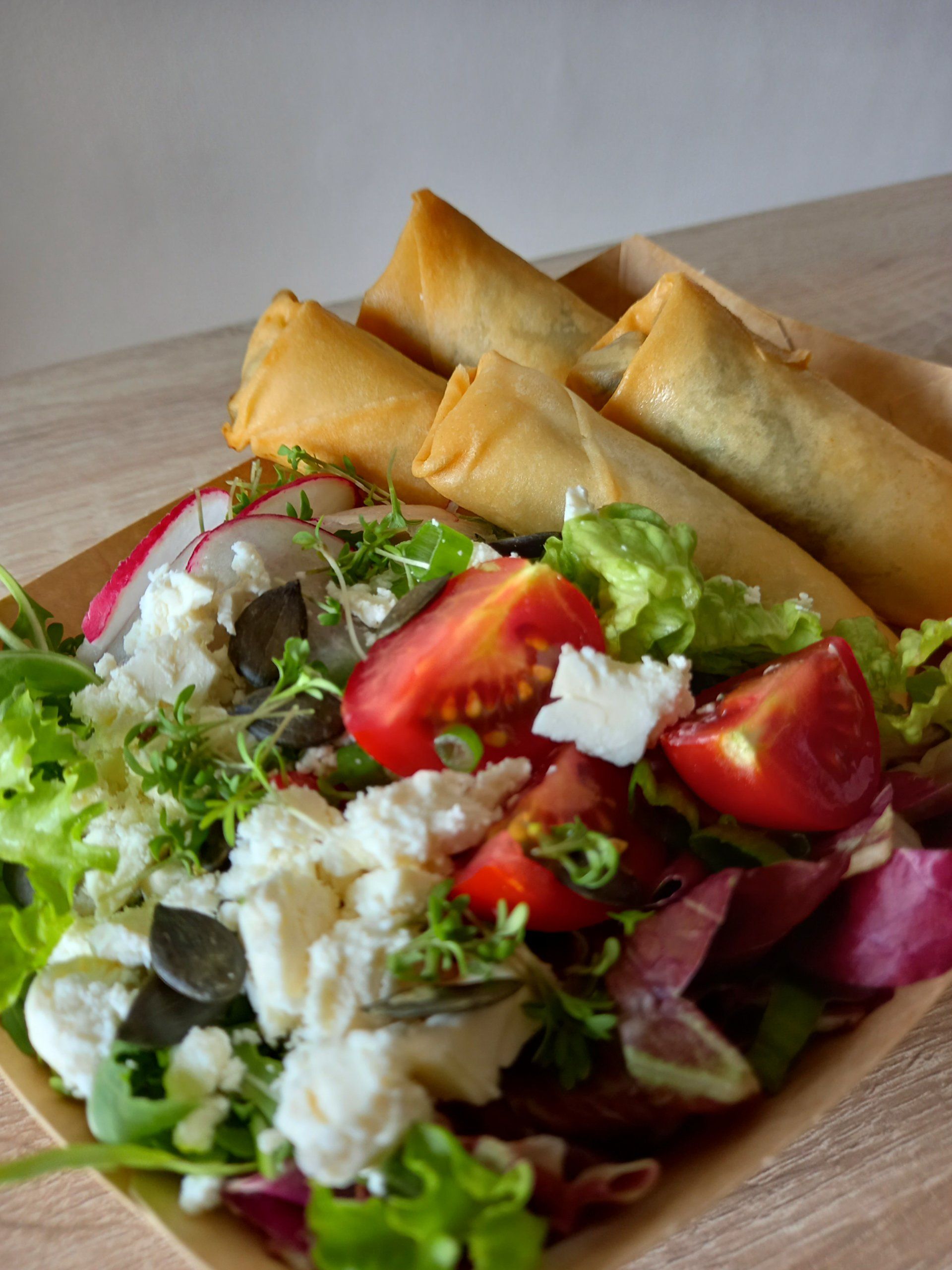 Saisonbedinger Salat, cremiger Sauerrahmdip mit Veggie Rolls.